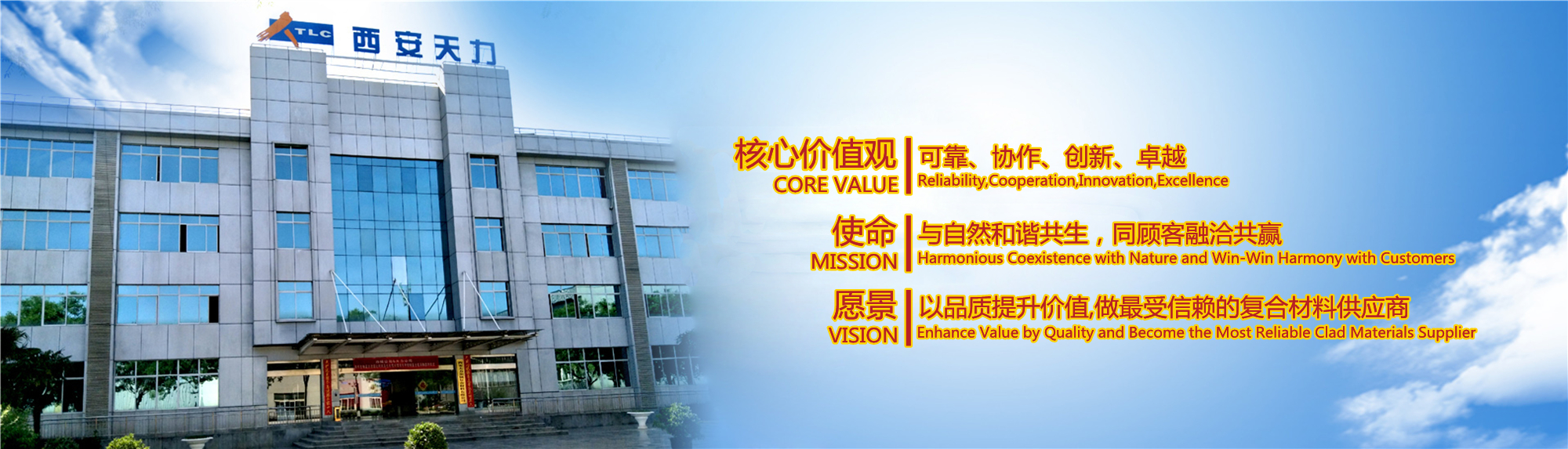 西安天力金属复合材料股份有限公司是西北有色金属研究院(集团)产业化上市公司“西部材料”控股的独立法人公司,是专业从事层状金属复合材料研究及生产的高新技术企业,成立于2003年12月25日,位于西安经济技术开发区泾渭工业园,注册资本10895万股,拥有生产厂房23000余平米,各类生产设备200余台套及两块条件优越的爆炸复合场地,形成年产25000吨层状复合材料的生产加工能力……